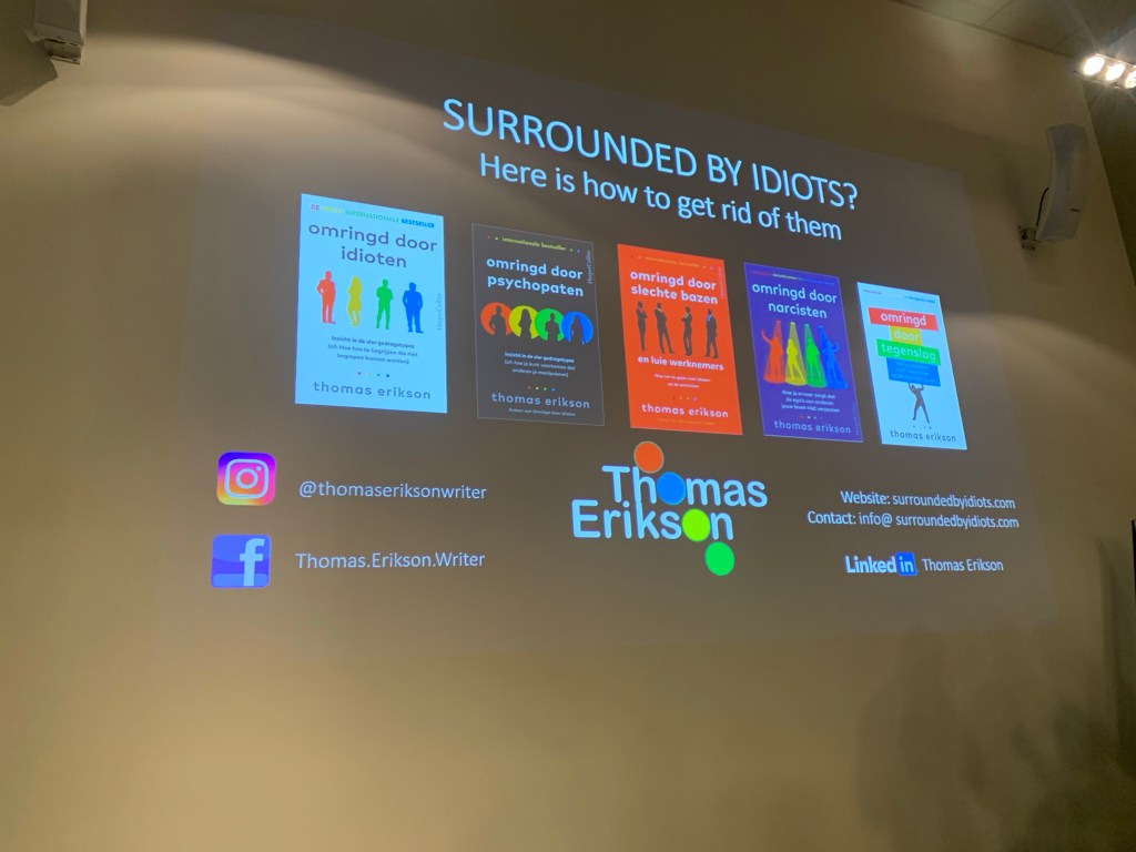 Thomas was dan ook in zijn element als hij sprak over deze vier types en gedragingen. En het leuke aan zijn voordracht is het gebruik van humor, iets waar hij heel goed in is, en hoe hij aan de hand van anekdotes een moeilijke materie voor iedereen verstaanbaar kan maken. (Dat doet hij trouwens ook in zijn boeken)