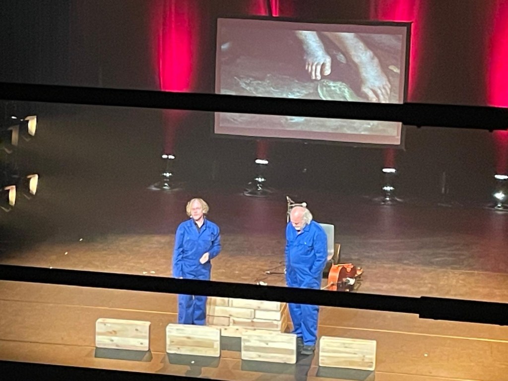 Terwijl we luisterden naar Hendrik, liep Frans Grapperhaus ook op het toneel rond en sleurde deze met houten rechthoekige blokken die ofwel eens grenzen tussen de landen voorstelden, dan weer een treinstel of zelfs kandidaten (en hun volgers) om Europees Voorzitter te worden… Maar Grapperhaus begeleidde Hendrik ook muzikaal met zijn cello! Vooral bij het laatste betoog van Hendrik speelde Frans gedreven en vol passie op zijn instrument (soms net iets te luid waardoor Hendrik nog luider moest praten, al dan niet was dit de bedoeling maar persoonlijk vond ik het een beetje storend) om te eindigen in de Europese hymne (ofwel de negende symfonie van Beethoven, maar dan zonder de gezongen tekst!)