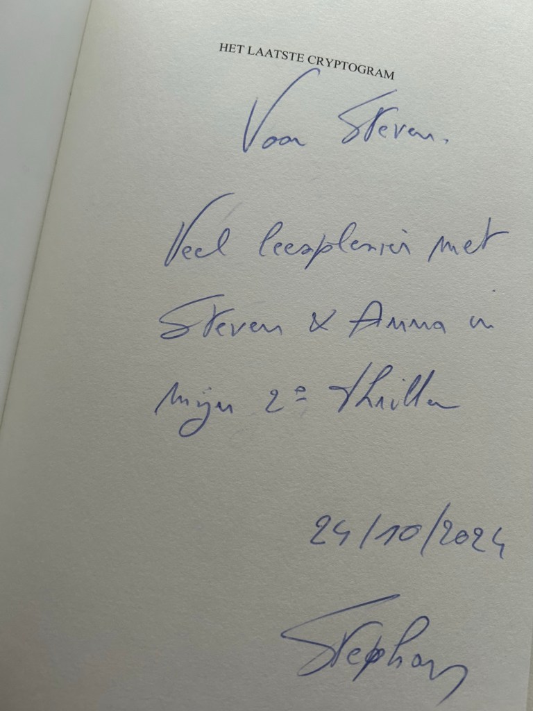 Ik moet toegeven dat ik van de auteur nog niet eerder had gehoord, dat zijn boeken nog niet op mijn pad waren langs gekomen, tot ik in oktober 2024 opnieuw aanwezig was op de thrilleravond die werd georganiseerd door Standaard Boekhandel Deinze. Toen zat in het publiek een heel sympathiek man en een heel lieve vrouw die me hoorden klagen tegen de auteurs over hoe bloggers vaak minder gewaardeerd worden door de zogezegde professionele recensenten. (Neem van me aan, dat punt ligt gevoelig bij iemand die al dertig jaar en langer boeken leest en intussen al een jaar of vijf niks anders doet dan deze te recenseren). Toen Stephan en Viviane hoorden hoe gepassioneerd ik over bloggen en boeken (in dit geval thrillers) sprak werd ik op de schouder getikt met de vraag: “Wil je niet een van Stephans boeken lezen en recenseren?” Ik was best verbaasd over de vraag maar was ook geïntrigeerd en benieuwd en vooral, door hun innemende reactie was ik gecharmeerd en zei direct toe. Ik kreeg echter niet eerder de kans om het te lezen maar wist, januari wordt dé maand. (Ik wil dit jaar met een maandelijks thema lezen en vaak zal dit een kleur zijn en in januari spreken ze over ‘blauwe maandag’ dus wou ik allemaal boeken met blauwe covers of blauw in de cover lezen… deze heeft dit ook dus perfect!)