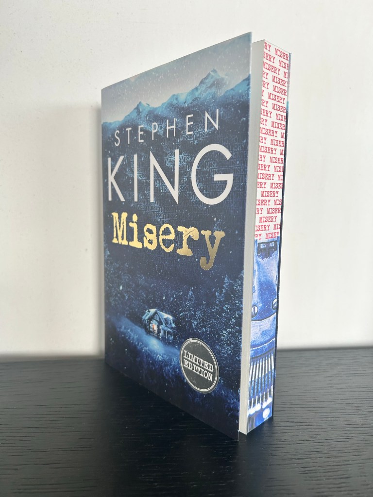 En zoals je op de foto’s hieronder ziet, het boek verscheen enkele jaren geleden bij LS Uitgeverij in een nieuw gelimiteerd jasje met fantastische sprayed edges, waar de typmachine die Paul Sheldon moet gebruiken van Annie Wilkes op gedrukt staat!