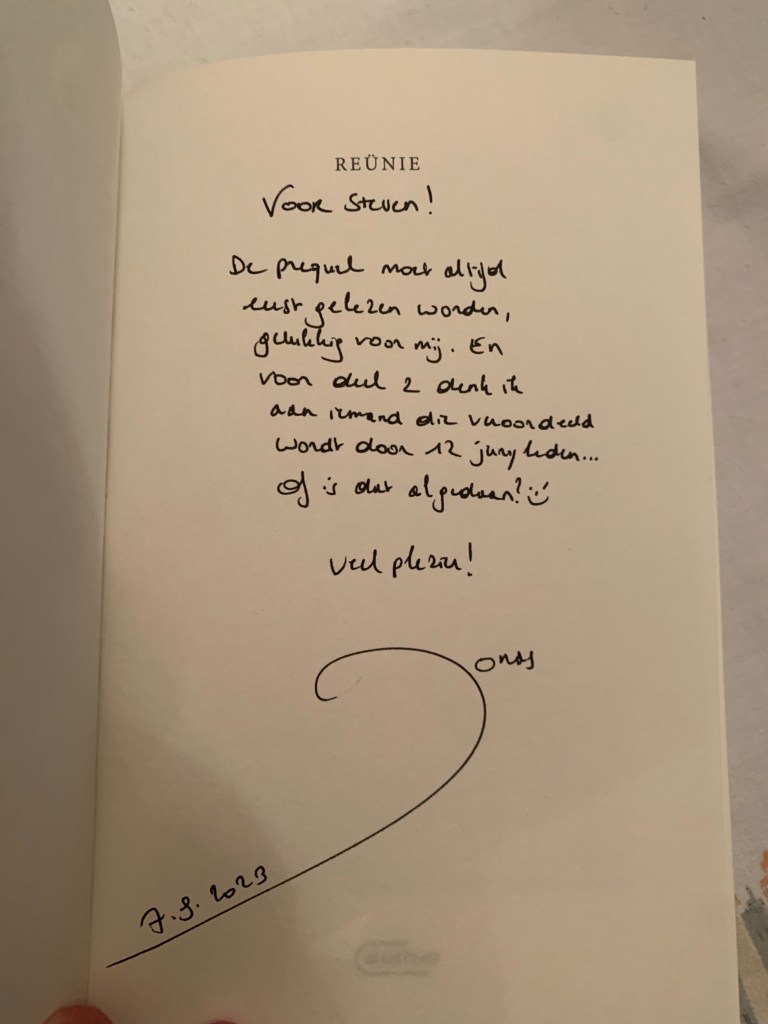 Op 6 september 2023 mocht ik de voorstelling van dit boek meemaken in Café Vlissinghe in Brugge waar Standaard Uitgeverij in gesprek ging met Jonas Boets over Reünie en zijn manier van werken. Zelf mocht ik heel kort even in gesprek gaan met de schrijver.