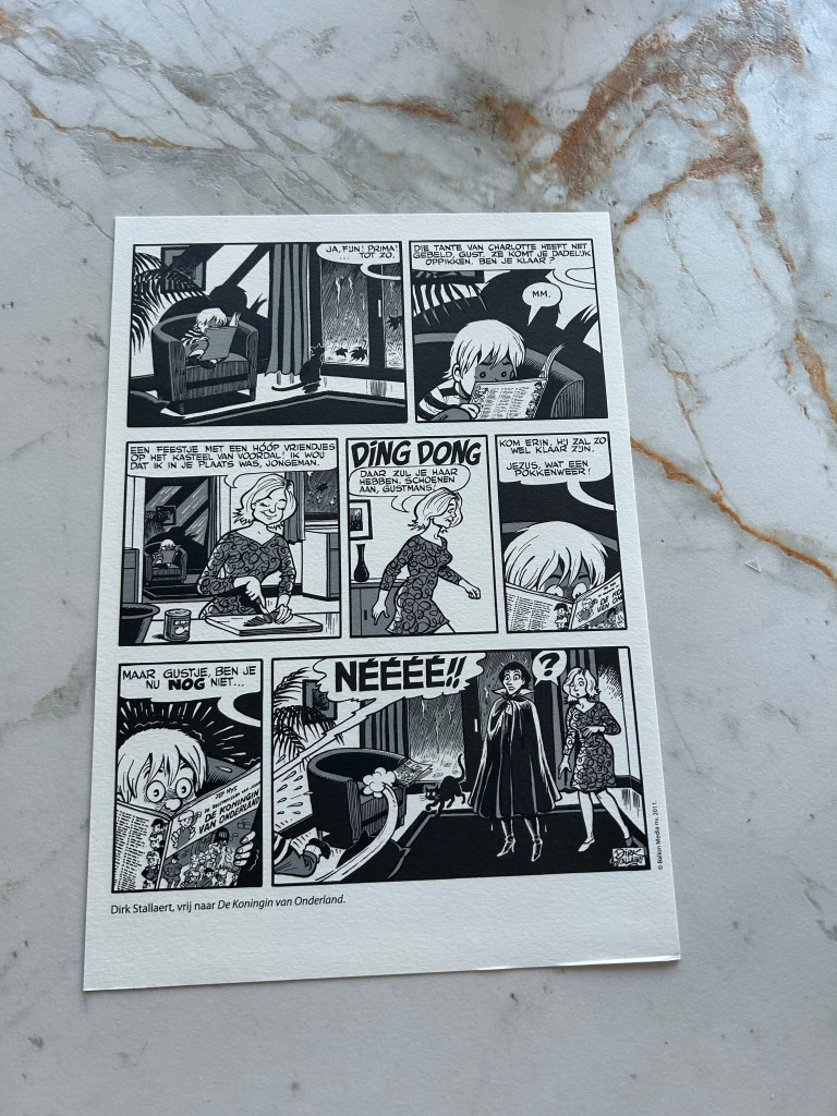 Ergens vind ik het wel jammer dat ik de eerste drie albums van Jommeke niet in de originele uitgave heb (niet in kleur, met de originele tekeningen… misschien ga ik daar ooit nog wel eens naar op zoek) want je merkt dat deze versie een geüpdate versie is waarbij iedereen getekend is zoals ze later ook verschijnen in de reeks. Natuurlijk is Flip een soort van Deus Ex Machina in dit verhaal, zoals in zovele andere, waarbij hij op onderzoek gaat voor Jommeke omdat de papegaai makkelijk overal binnen kan dringen. Maar of hij deze keer zo makkelijk ongemerkt door het kasteel kan wandelen, valt nog af te wachten met de zwarte onderdanen van de koningin.