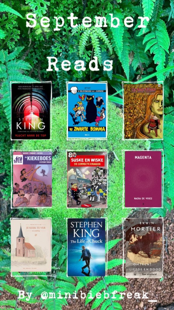 Ik heb mezelf in september uitgedaagd… Ik wil namelijk om de zomer af te sluiten en de herfst in te luiden elke dag een boek uithebben dus tegen het eind van de maand zouden er dertig titels moeten staan in mijn lijstje… dat kan gaan van heel dikke boeken maar natuurlijk zullen daar ook veel novelles en kleinere / dunnere boekjes bij zijn. Dertig dagen, dertig boeken! Opvallend is ook dat ik redelijk wat Nederlandse auteurs heb ontdekt en gelezen deze maand, waaronder Emily Kocken die me vroeg om haar nieuwe boek dat deze maand verscheen te lezen en te recenseren. Daarnaast mocht ik ook een vooruitexemplaar van de nieuwste Saskia de Coster lezen en ontdekte ik nog heel wat pareltjes. September was de maand van minder strips en minder films maar vooral op jacht gaan naar het behalen van mijn challenge…