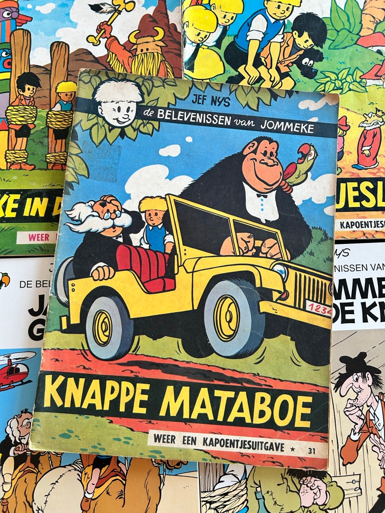 In dit verhaal ontmoeten we de begijntjes opnieuw, maar ze zijn wel al met heel wat minder dan de vorige keer dat Jommeke hen ontmoette én ze zijn ook al ietsje moderner (de korte minirok die zo populair was in de jaren zestig doet ook bij hen al intrede, net als verdedigings- en gevechtssporten, in dit geval judo). Mataboe, de gorilla, maakt hierin zijn debuut. Hij zal in latere verhalen zeker ook nog terugkomen en de vrienden helpen. Dit album is eentje met een terugkerende gag die ik vaak herhaal als ik een politieagent op een motor zie rijden… Vroeger werden deze in de volksmond ‘zwaantjes’ genoemd (geen idee of dat nog zo is eigenlijk) en Mataboe die alles nogal letterlijk durft nemen heeft daar dan ook een oplossing voor, die Gobelijn en Jommeke af en toe uit de puree zal helpen… Want Mataboe zegt altijd, ‘zwaantjes horen in het water’ en dan gooit ie ook de agent in een vijver nabij… Zelf heb ik nooit een agent het water in geduwd of gegooid (zo ben ik niet natuurlijk) maar het zinnetje zeg ik dan wel als ik een gemotoriseerde flik zie rijden… Het blijft een klassiekertje!